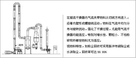 ▲干燥強度大、設備投資省、蒸發(fā)能力大,可從50kg/h~2000kg/h; ▲干燥時間短,適用于熱敏性物料,成品不與外界接觸,無污染,質量好; ▲設備成套提供,熱源可選擇蒸汽加熱或配套使用燃煤、燃油、燃氣熱風爐等。 ▲基本型氣流干燥設備,適用于松散狀、粘性小、成品為顆粒及粉末的物料。此流程示意為負壓氣流干燥,用戶可根據產品特性選擇正壓形式的干燥方法。 工作原理 ![]()